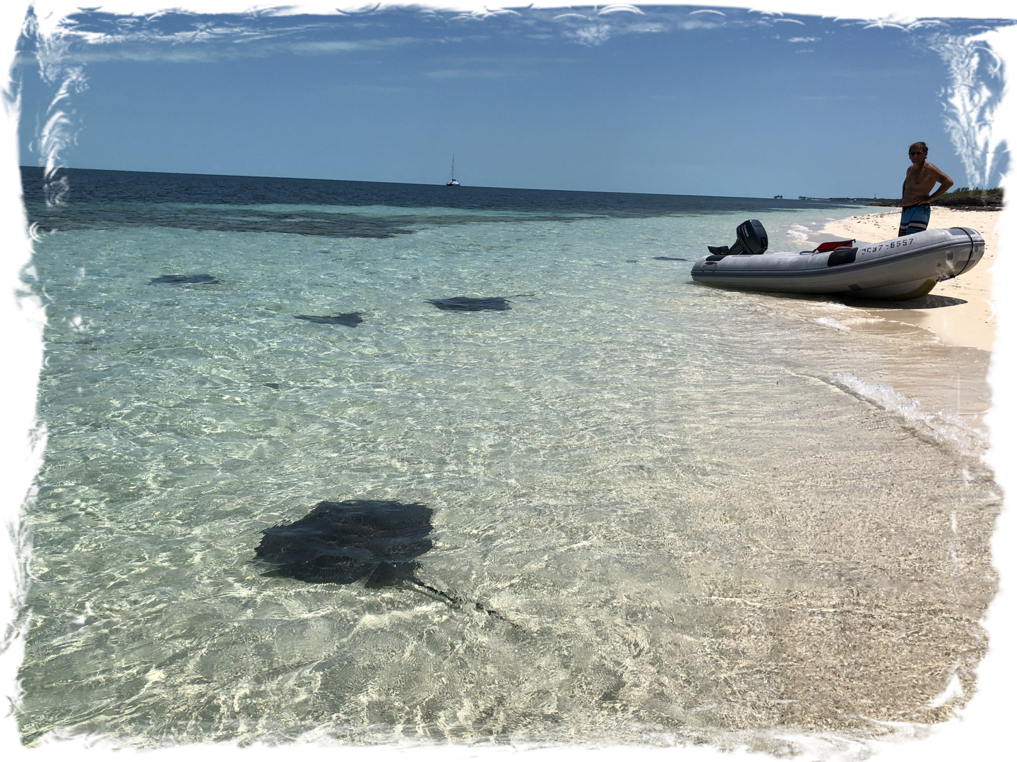Gun Cay - Le long de la plage, au niveau du quai, les raies sont nombreuses, trop habituées à recevoir des restes de conches Timides, quelques requins nourrices restent autour.