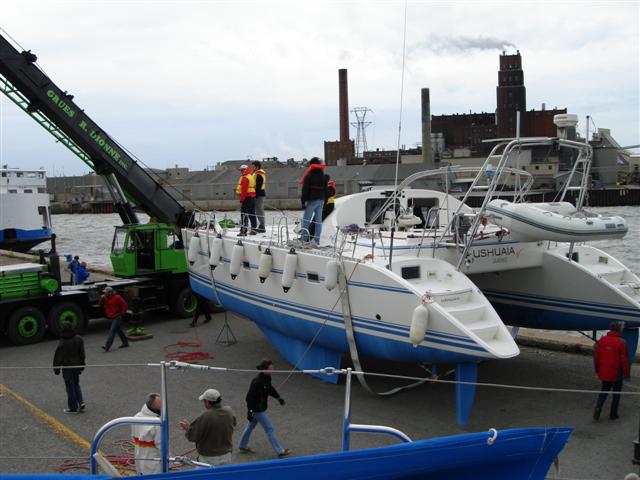 Octobre 2005 : les feuilles tombent et la température extérieure aussi (2 degrés Celsius).Les deux catamarans, Aupaluk et Ushuaia sont maintenant sur le quai du port de Québec. Hiverner le bateau n'a pas été une partie de plaisir. Au total, 80 litres d'antigel dans tous les tuyaux , frottage des coques, des fonds et le tout sous une belle pluie d'automne. Les moteurs seront changés en novembre par le chantier de Boulet Lemelin. Le mat a été enlevé afin de mettre a neuf le gréement dormant. Les voiles passeront l'hiver au chaud chez Saintonge(voilerie a Québec)ou quelques réparations leur redonneront un peu de jeunesse...